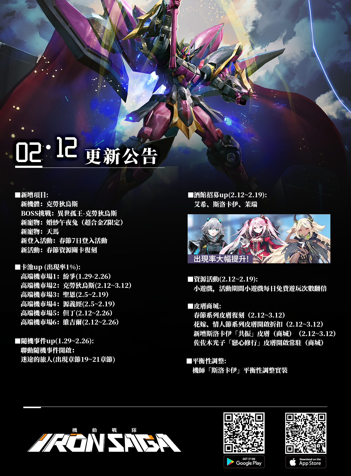 《機動戰隊》將於2月12日晚上進行不停服更新,(預計18:00左右更新,實際更新完成時間請以官方最新通告為準)