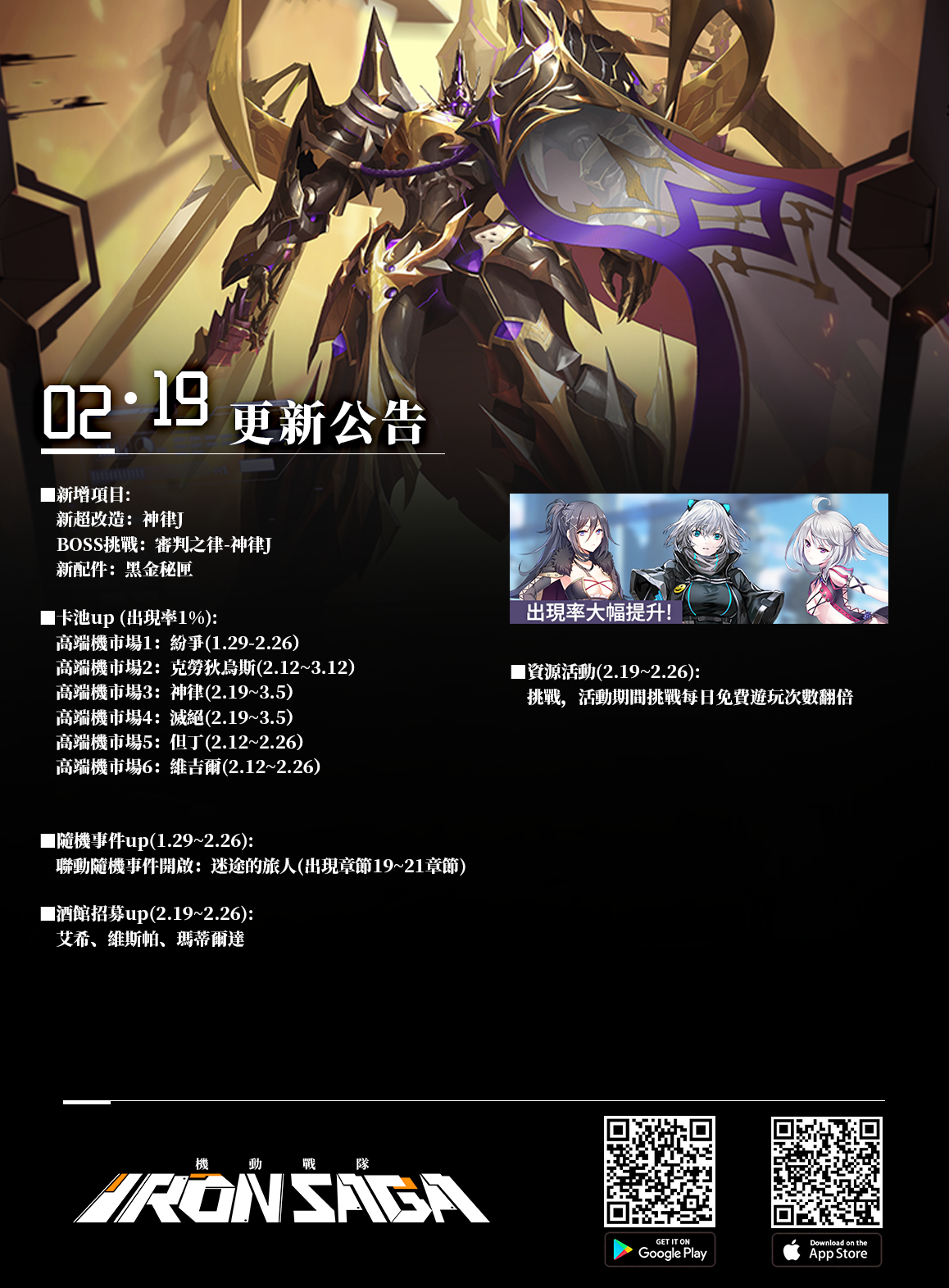 《機動戰隊》將於2月19日晚上進行不停服更新,(預計18:00左右更新,實際更新完成時間請以官方最新通告為準)